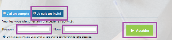 1- Sélectionner je suis un invité, inscrivez votre nom et votre prénom, ensuite cliquez sur accéder.